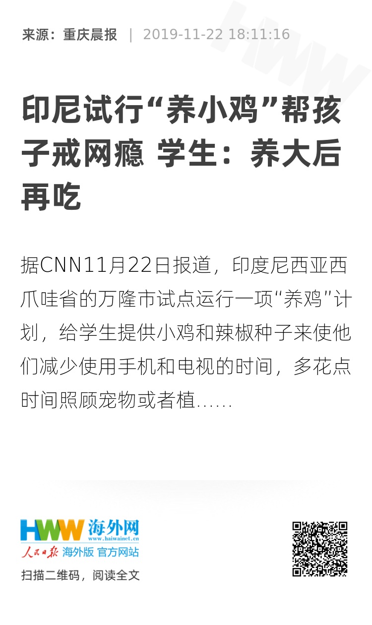 据CNN11月22日报道,印度尼西亚西爪哇省的万隆市试点运行一项“养鸡”计划,给学生提供小鸡和辣椒种子来使他们减少使用手机和电视的时间,多花点时间照顾宠物或者植物,希望可以让孩子免于网络成瘾。