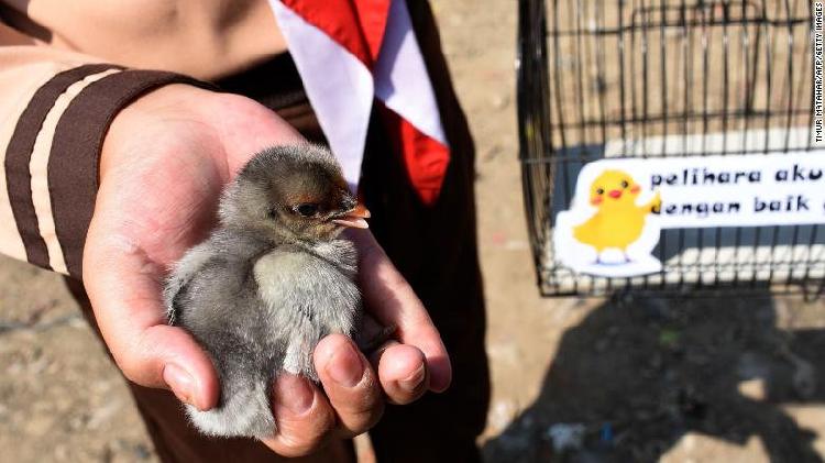 印尼学生看着笼子里的小鸡,上面写着“请好好照顾我”。(图片来源:CNN)