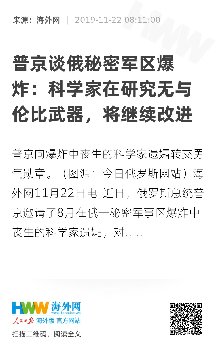 海外网11月22日电 近日,俄罗斯总统普京邀请了8月在俄一秘密军事区爆炸中丧生的科学家遗孀,对他们进行慰问。普京提到,遇难的核科学家们正在研发对俄罗斯至关重要的、无与伦比的武器,他还誓称将会继续改进这一技术。