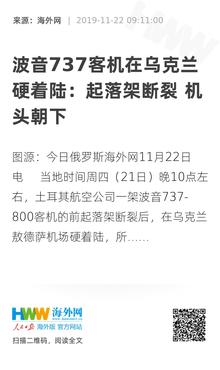 海外网11月22日电 当地时间周四(21日)晚10点左右,土耳其航空公司一架波音737-800客机的前起落架断裂后,在乌克兰敖德萨机场硬着陆,所幸没有造成人员伤亡。