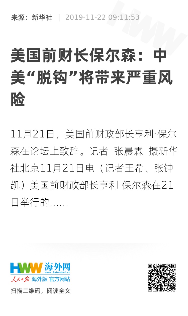 保尔森说,美中需要采取切实举措让大家看到双方有可能朝向共同的未来,反之,持续的金融“脱钩”将引发不稳定性。