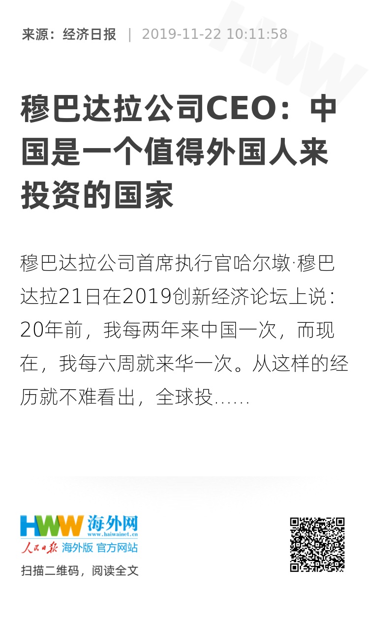 穆巴达拉公司首席执行官哈尔墩·穆巴达拉21日在2019创新经济论坛上说:20年前,我每两年来中国一次,而现在,我每六周就来华一次。从这样的经历就不难看出,全球投资界在过去20年发生了怎样的变化。阿布扎比处于东西方的交汇点,从历史来看,我们曾经主要是投资于西方,而现在我们在投资西方的同时,正在向东方迈进。中国是一个了不起的地方,是一个值得外国人来这里投资的国家。中国一定会成为世界最大经济体,这只是时间的问题。虽然全球经济学家对此持不同观点,但对于投资人而言,从长远来看,我们要积极在中国进行投资。投资中国是我们的一项重要战略,对此,我深信无疑。在过去5到10年里,我们都看到了中国的巨大转变。营商环境在越来越好,在这里做生意更加容易了,中国企业家数量越来越多了,这是非常了不起的变化。此外,我们看到了中国技术的飞跃,无论是生命科学领域还是交通领域,从全球投资人的角度来讲,技术的发展让我们非常想参与中国的投资。对于外国直接投资,中国越来越开放,虽然我们也看到了挑战,但更重要的是,我们看到中国在诸多方面所取得的进步,并且看到这些进步的持续性。我相信,未来,中国会取得更多的进步。因为,我们在这里看到中国的蓬勃生机,中国企业家的创新创业精神很是了不起。如阿里巴巴、腾讯等等中国的创业者们在引领企业的转型,让这些企业成为全球领先的企业,这使得它们不仅在中国,在全球都具有竞争力。 中国的企业家们最大的特点是具有挑战精神,这就使得中国的企业具有国际竞争力。中国本就是一个很大的市场,因为持续开放,中国市场必将成为全球的机遇。