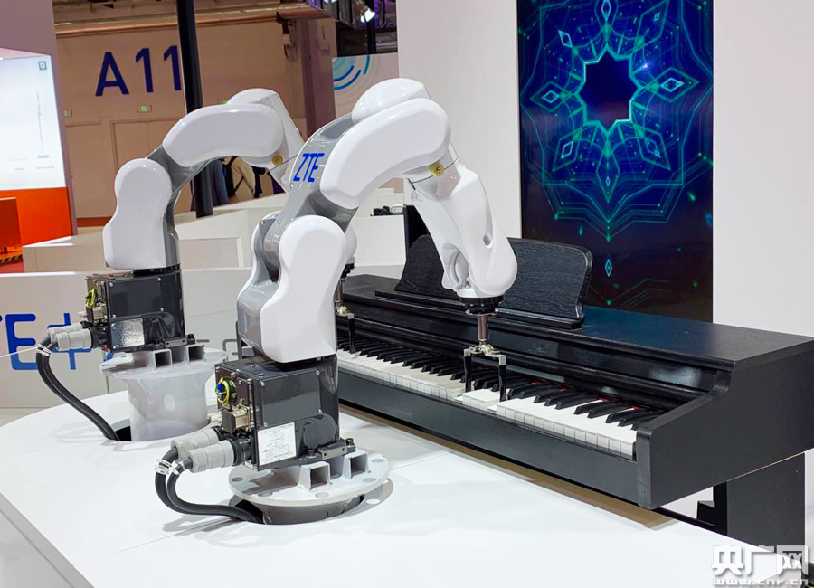行走展厅之中,《茉莉花》的旋律阵阵传来,原来,中兴展台的机械臂乐队已经开始了它们的表演。两台机械臂优雅地弹着琴,弹完不忘向观众“举手”致意。(央广网记者马文静 摄)