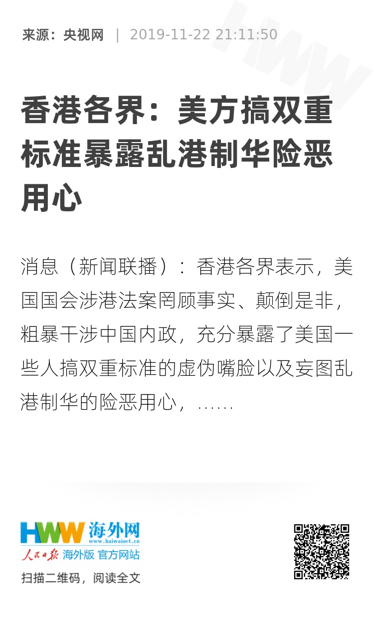 央视网消息(新闻联播):香港各界表示,美国国会涉港法案罔顾事实、颠倒是非,粗暴干涉中国内政,充分暴露了美国一些人搞双重标准的虚伪嘴脸以及妄图乱港制华的险恶用心,美方的错误做法必将损害其自身利益。