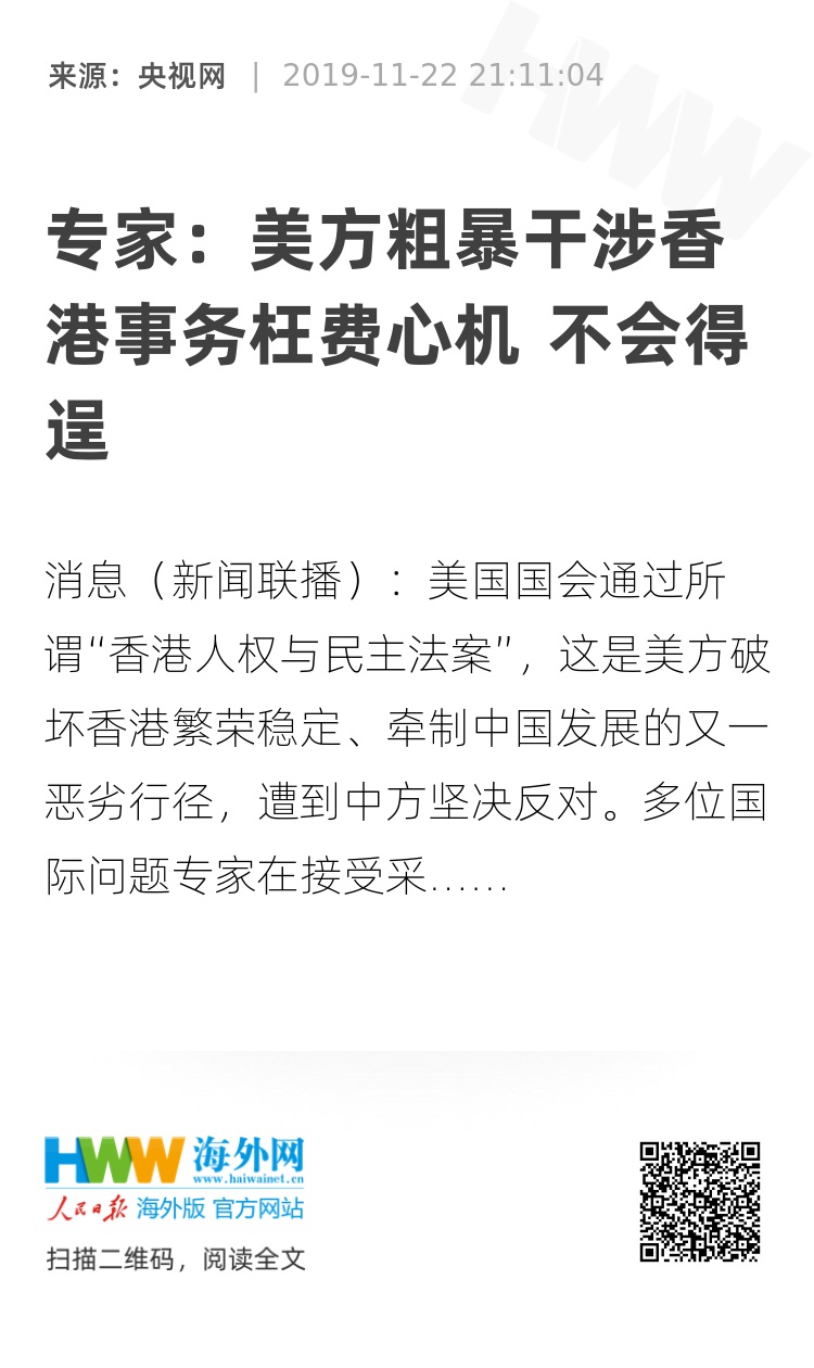 央视网消息(新闻联播):美国国会通过所谓“香港人权与民主法案”,这是美方破坏香港繁荣稳定、牵制中国发展的又一恶劣行径,遭到中方坚决反对。多位国际问题专家在接受采访时表示,美国的图谋枉费心机,不会得逞。