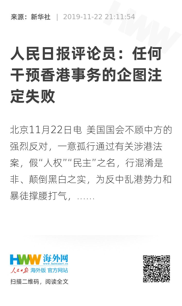 新华社北京11月22日电 美国国会不顾中方的强烈反对,一意孤行通过有关涉港法案,假“人权”“民主”之名,行混淆是非、颠倒黑白之实,为反中乱港势力和暴徒撑腰打气,企图把香港推向持续动荡的深渊,实现遏制中国发展的政治图谋。我们正告美方,任何搞乱香港、损害中国良好发展局面的企图都是痴心妄想,任何干预香港事务的企图注定失败。