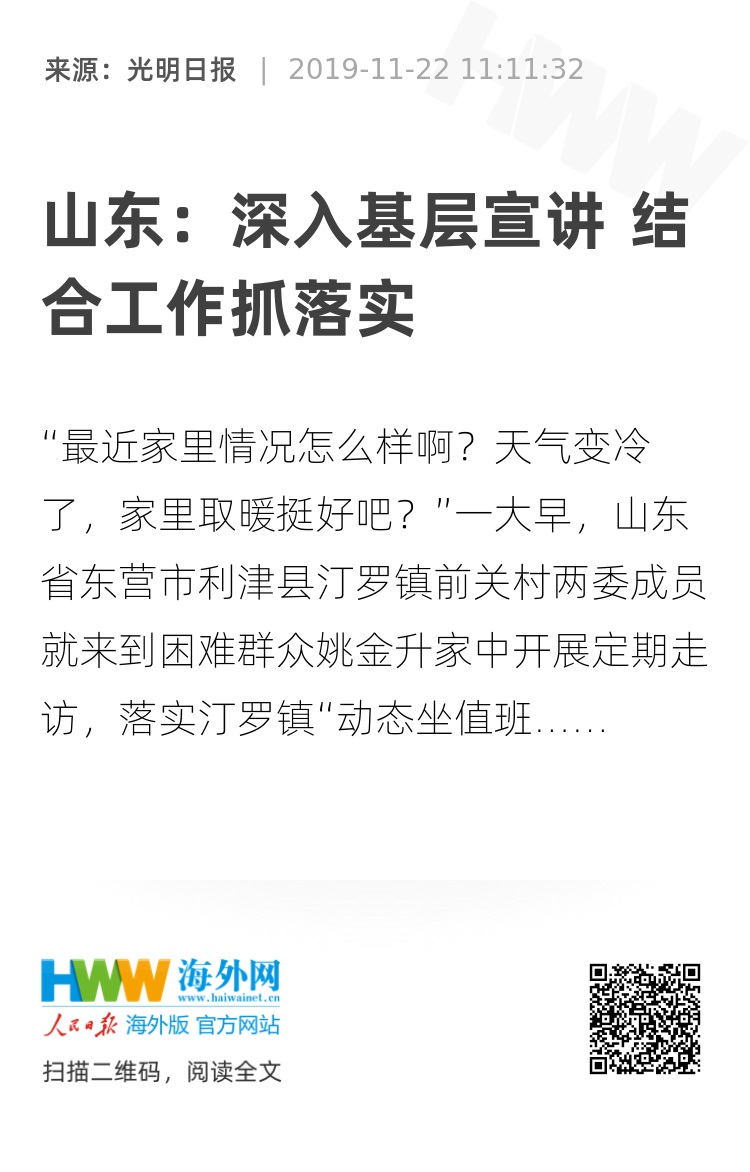 11月18日起,山东省学习贯彻党的十九届四中全会精神宣讲团分赴山东各地、各企业开展集中宣讲活动,宣讲团成员结合当地和企业发展实际,深入阐释了全会的重大意义,深刻论述了中国特色社会主义制度和国家治理体系的显著优势,系统解读了全会通过的《决定》提出的总体要求、总体目标和重点任务,并与基层干部群众互动交流,引起热烈反响。