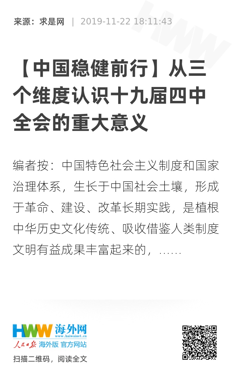 编者按:中国特色社会主义制度和国家治理体系,生长于中国社会土壤,形成于革命、建设、改革长期实践,是植根中华历史文化传统、吸收借鉴人类制度文明有益成果丰富起来的,不仅保障了我国经济快速发展和社会长期稳定的奇迹,也为多元文明共生并进的人类社会发展增添更多色调、更多范式、更多选择。党的十九届四中全会通过的《中共中央关于坚持和完善中国特色社会主义制度、推进国家治理体系和治理能力现代化若干重大问题的决定》,从13个方面系统总结和深刻阐述了我国国家制度和国家治理体系的显著优势,紧紧围绕“坚持和巩固什么” “完善和发展什么”,提出了一系列新思想新观点新举措,提出了把新时代改革开放推向前进的根本要求,是我们坚定“四个自信”的基本依据。为深入学习宣传党的十九届四中全会精神,中央网信办与求是杂志社共同组织“中国稳健前行”网上理论传播专栏,邀请思想理论界专家学者撰写系列理论文章,今天在求是网推出第1篇,敬请关注。