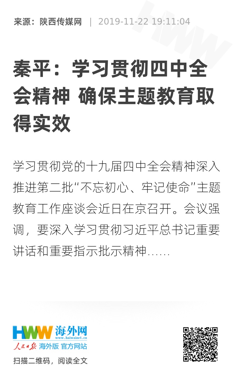 学习贯彻党的十九届四中全会精神深入推进第二批“不忘初心、牢记使命”主题教育工作座谈会近日在京召开。会议强调,要深入学习贯彻习近平总书记重要讲话和重要指示批示精神,学习贯彻党的十九届四中全会精神,从严从实做好各项工作,确保主题教育顺利实现预期目标、取得实实在在的成效,向党和人民交上一份满意的答卷。