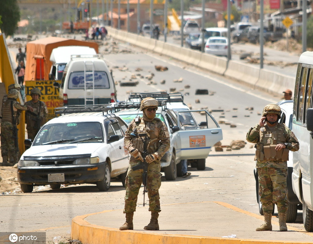 当地时间2019年11月22日,玻利维亚科恰班巴,道路服务人员在警察和军方的协助下,清理通往圣克鲁斯的道路,清除路障,打破封锁。图源:东方IC
