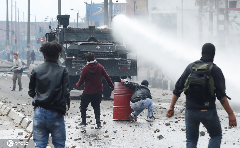 当地时间2019年11月22日,哥伦比亚首都波哥大,当地举行罢工游行,示威者与警方激烈冲突,抗议政府的养老金和工资改革。波哥大市政府宣布,鉴于波哥大局部地区当天出现的骚乱和冲突,从当晚开始在波哥大全城实施宵禁。图源:东方IC
