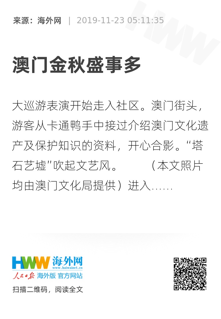 进入11月,澳门还是金秋天气,文化艺术活动日盛,庆祝回归20周年的喜庆气氛渐浓,新书出版、大展开幕、合唱颁奖、巡游预演、街头集市……喜悦中,澳门小城展示和分享着自己独特的历史与文化。