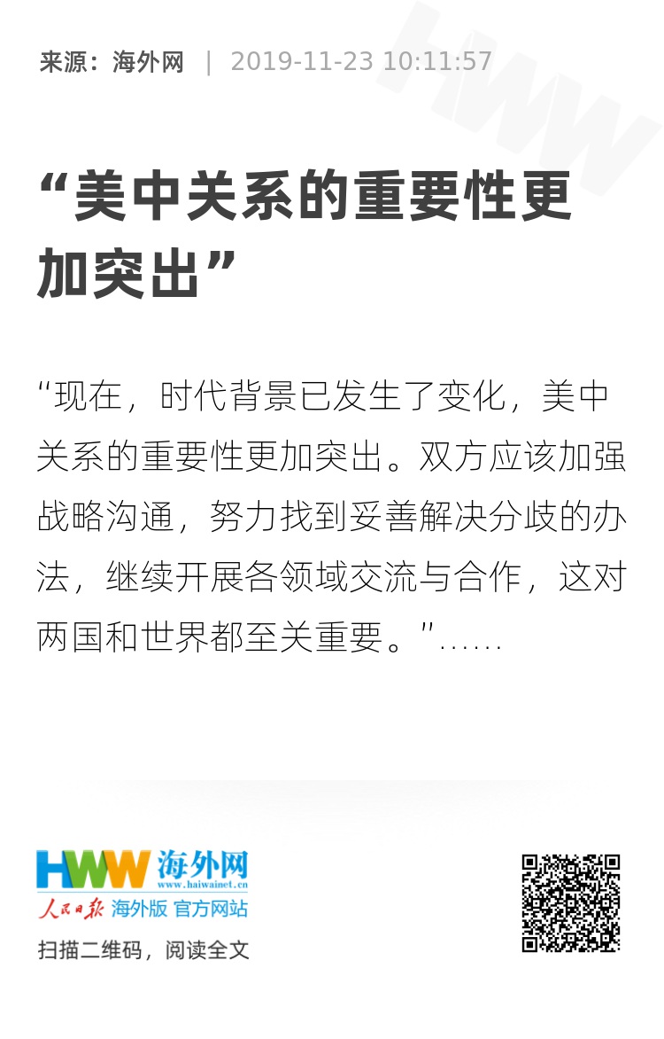 “现在,时代背景已发生了变化,美中关系的重要性更加突出。双方应该加强战略沟通,努力找到妥善解决分歧的办法,继续开展各领域交流与合作,这对两国和世界都至关重要。”美国前国务卿基辛格11月22日发表如是看法。连日来,他在不同场合就中美关系发展提出了许多有益主张。