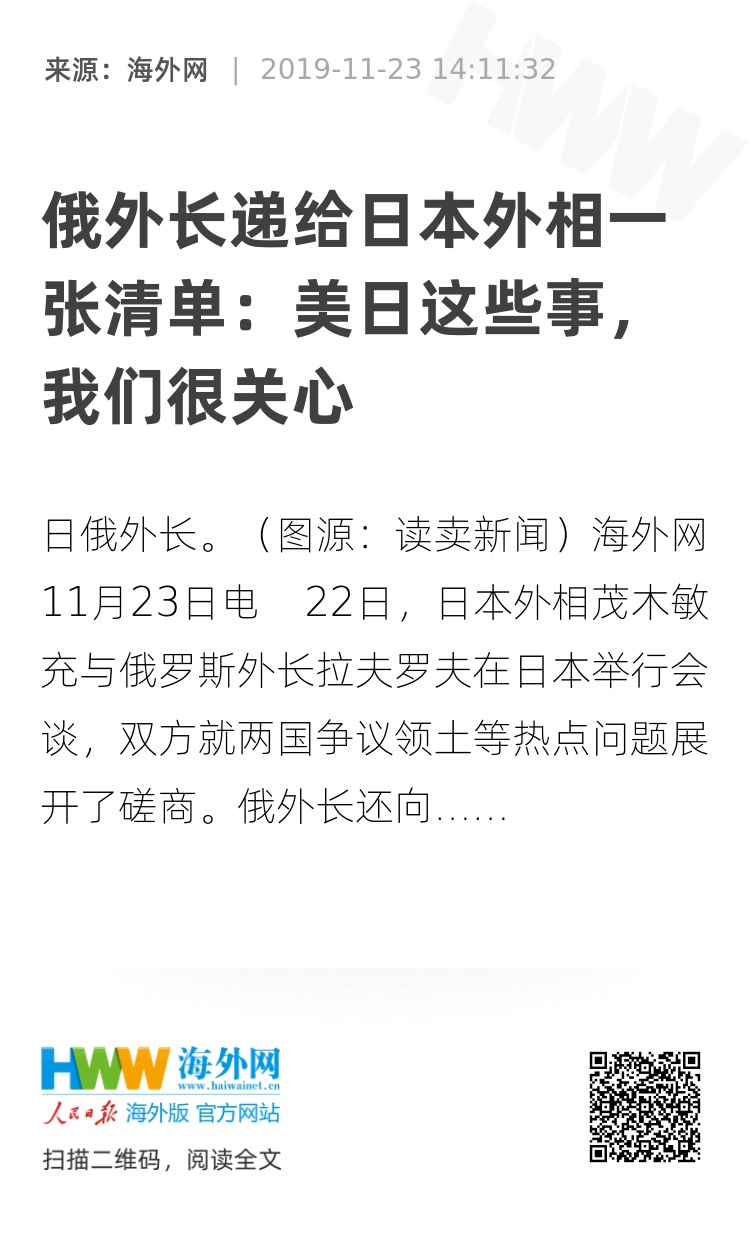 海外网11月23日电 22日,日本外相茂木敏充与俄罗斯外长拉夫罗夫在日本举行会谈,双方就两国争议领土等热点问题展开了磋商。俄外长还向日本方面递交了一份有关美日的“问题清单”,并就此表达关切。