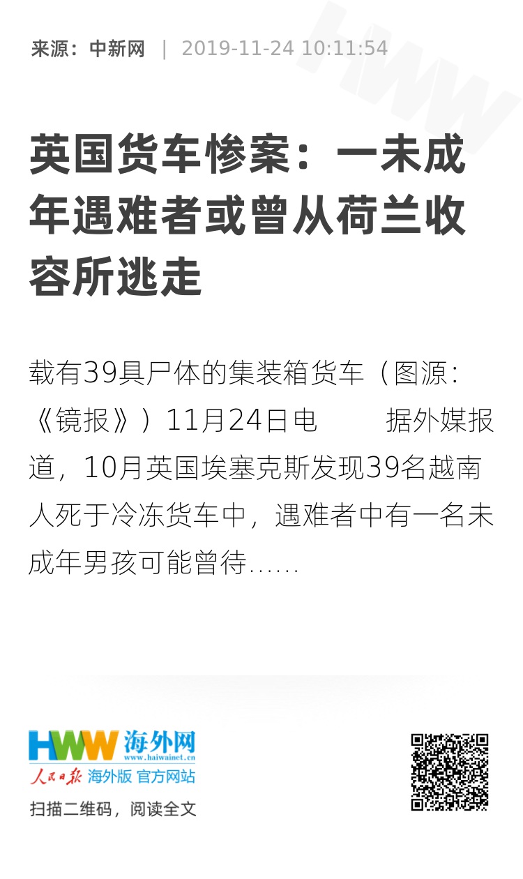 中新网11月24日电 据外媒报道,10月英国埃塞克斯发现39名越南人死于冷冻货车中,遇难者中有一名未成年男孩可能曾待在荷兰一座收容所,但后来潜逃离去。