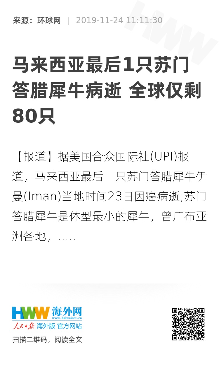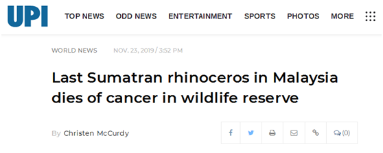合众国际社报道截图:马来西亚最后一只苏门答腊犀牛死于癌症