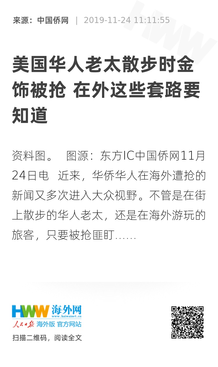 中国侨网11月24日电 近来,华侨华人在海外遭抢的新闻又多次进入大众视野。
