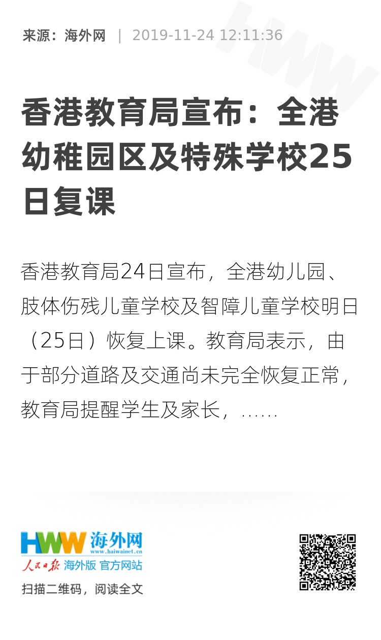 香港教育局24日宣布,全港幼稚园区及特殊学校25日复课。(图源:文汇网)