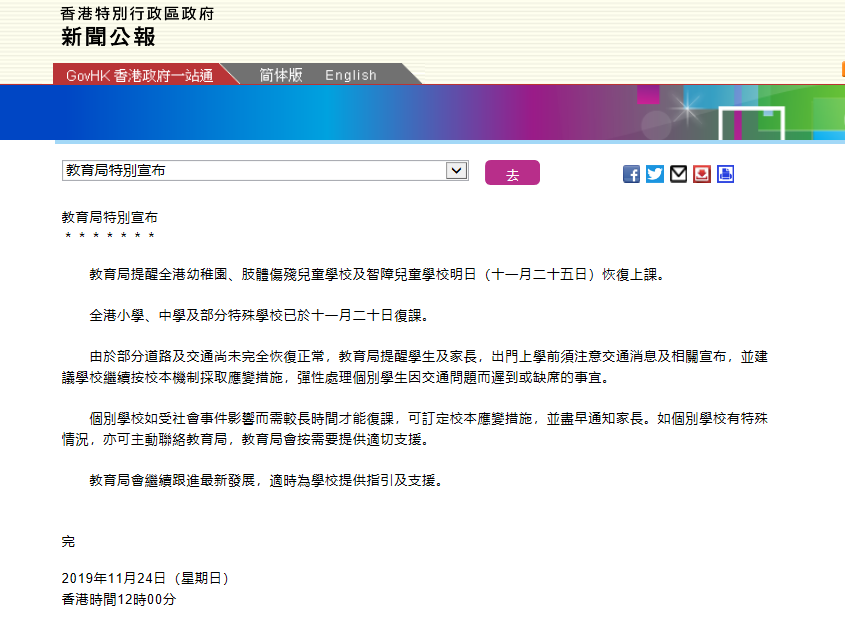 早前,由于暴徒在香港各区大肆破坏,设置路障,焚烧港铁站,导致路面及交通情况不稳定,影响学生上学。为此,香港教育局已多次宣布停课。