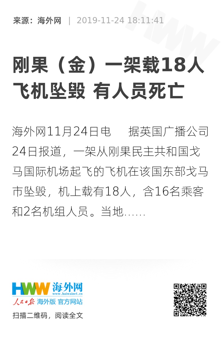 海外网11月24日电 据英国广播公司24日报道,一架从刚果民主共和国戈马国际机场起飞的飞机在该国东部戈马市坠毁,机上载有18人,含16名乘客和2名机组人员。当地官员称,事故已造成人员死亡,但未给出具体数字。
