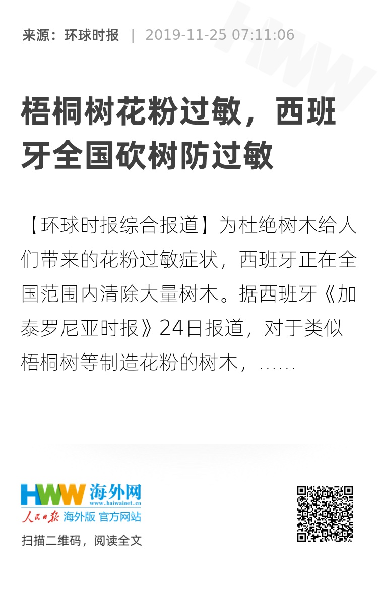 【环球时报综合报道】为杜绝树木给人们带来的花粉过敏症状,西班牙正在全国范围内清除大量树木。据西班牙《加泰罗尼亚时报》24日报道,对于类似梧桐树等制造花粉的树木,各地政府已下令砍伐,取而代之的是生长快、不娇嫩、树叶茂、无花粉的新树木品种。