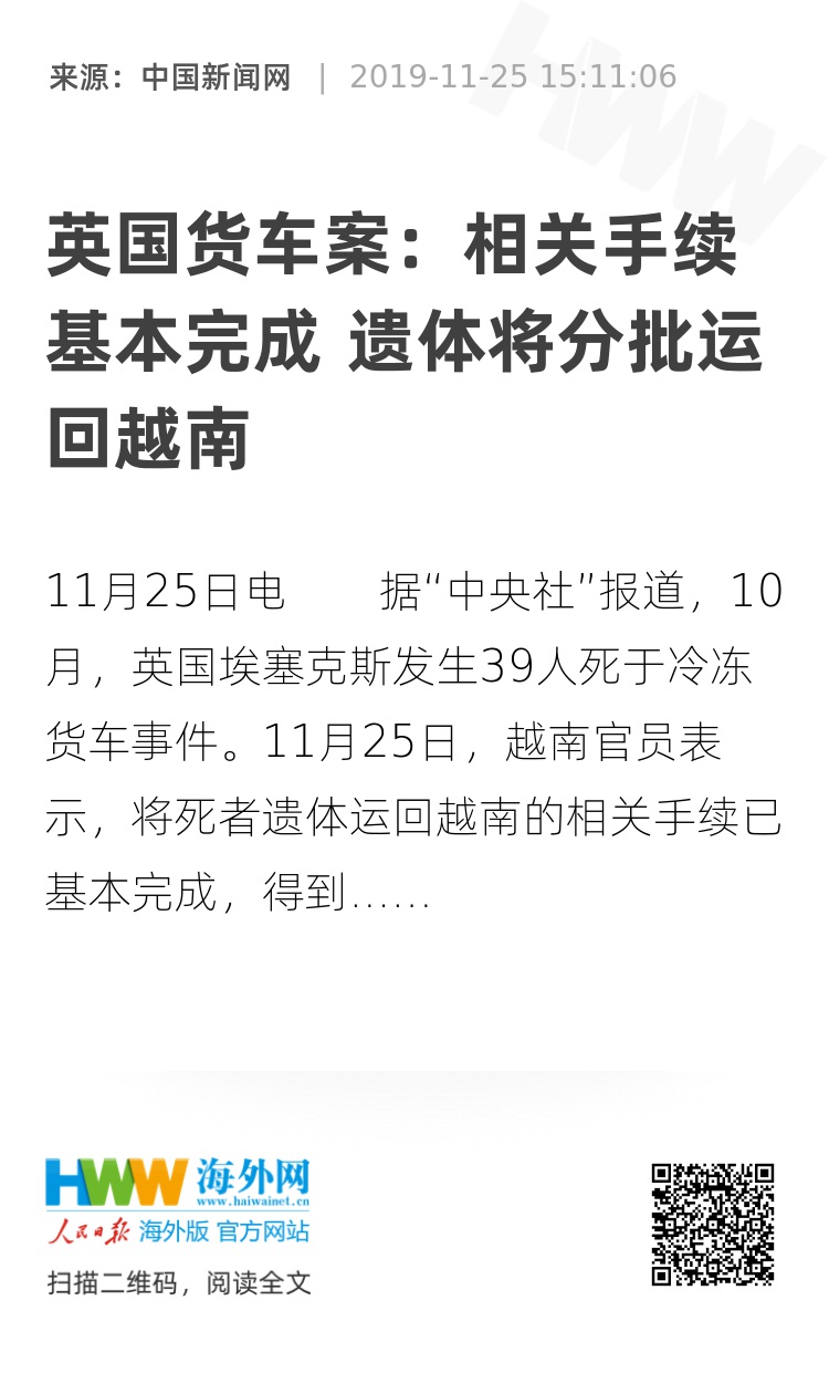 中新网11月25日电 据“中央社”报道,10月,英国埃塞克斯发生39人死于冷冻货车事件。11月25日,越南官员表示,将死者遗体运回越南的相关手续已基本完成,得到英国法官的批准许可后,将分批运回。