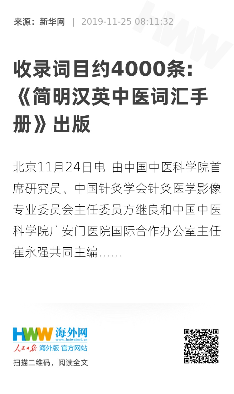 “这是国际公共卫生系统对传统医学价值的认可,具有里程碑意义。我们组织编写这本《简明汉英中医词汇手册》,就是响应第72届世界卫生大会,希望进一步助力中医药走向世界,更好服务国内外医生和患者。”方继良说。