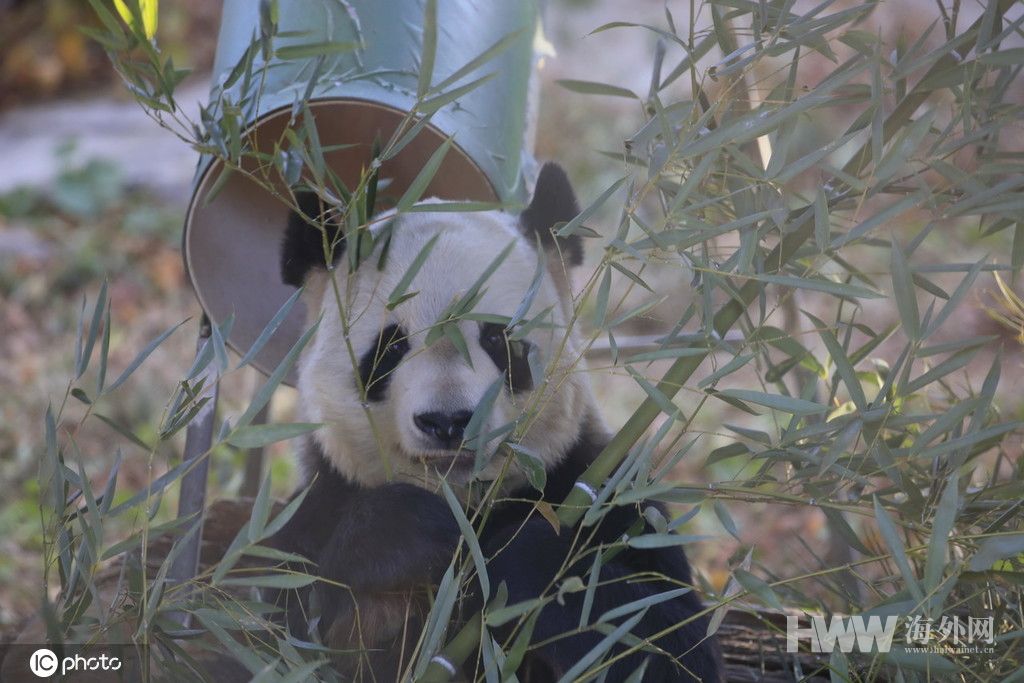 大熊猫冬日卖萌撒欢 吃着竹叶享暖阳