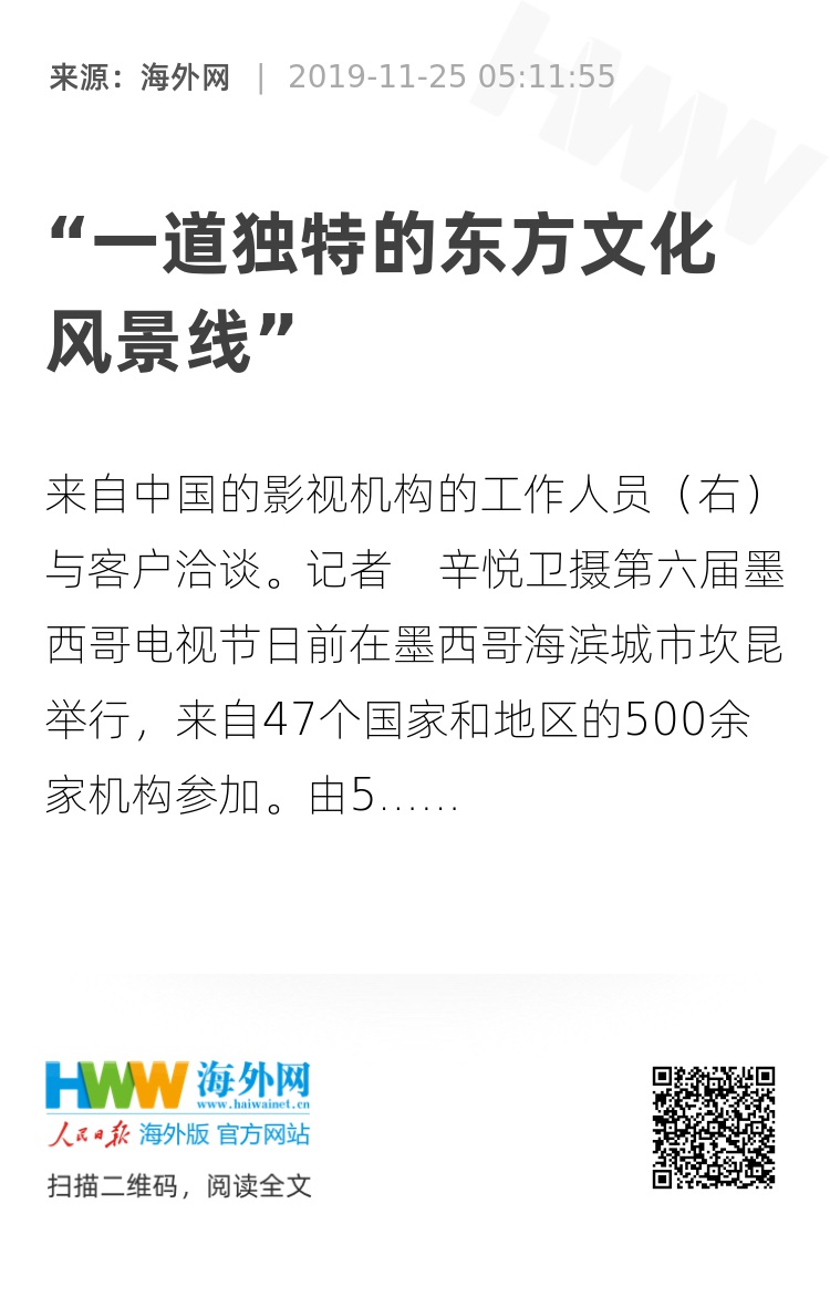 “中国影视作品为墨西哥电视节带来了一道独特的东方文化风景线。观众不仅能够从中领略中国传统文化的魅力,也可以感受到中国的快速发展。”墨西哥电视节总监贝内迪克特·图沙尔表示,中国联合展台为中国与拉美及全球影视机构提供了便利的交流平台,希望看到更多优秀中国影视作品来到拉美。