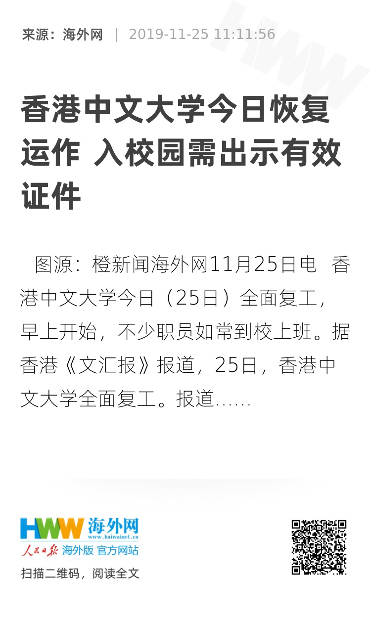 海外网11月25日电 香港中文大学今日(25日)全面复工,早上开始,不少职员如常到校上班。