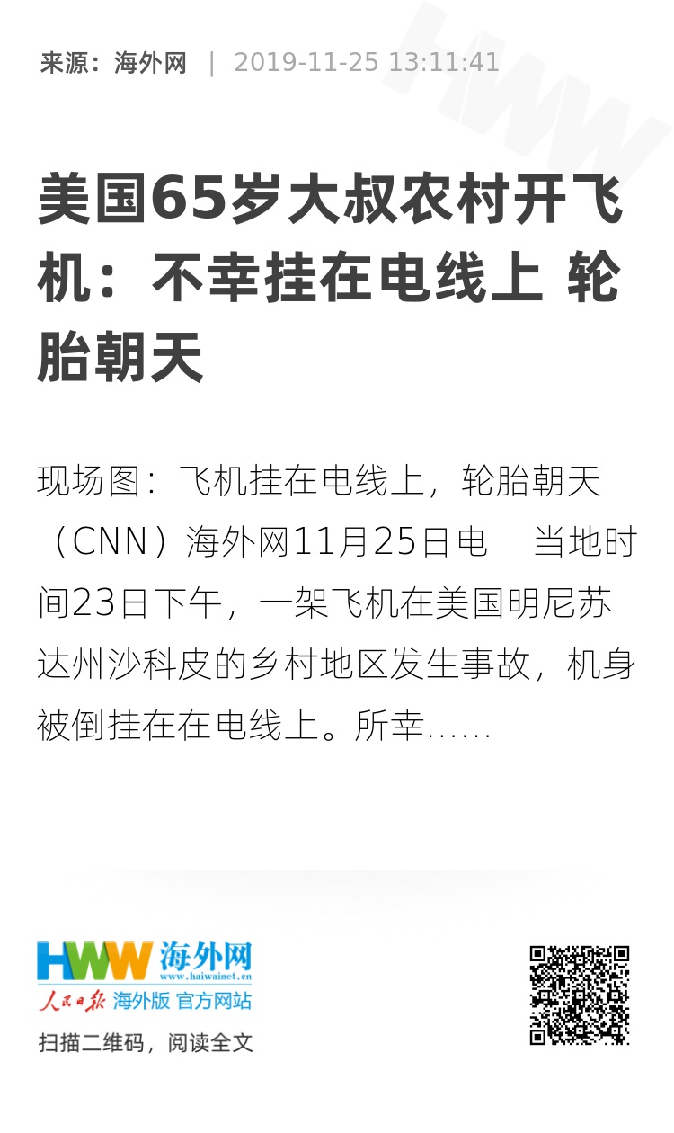 据美国有线电视新闻网(CNN)24日报道,明尼苏达州斯科特县警长办公室发布的消息称,出事的是一架单螺旋机飞机,在飞行途中撞上电线,机身被倒挂。