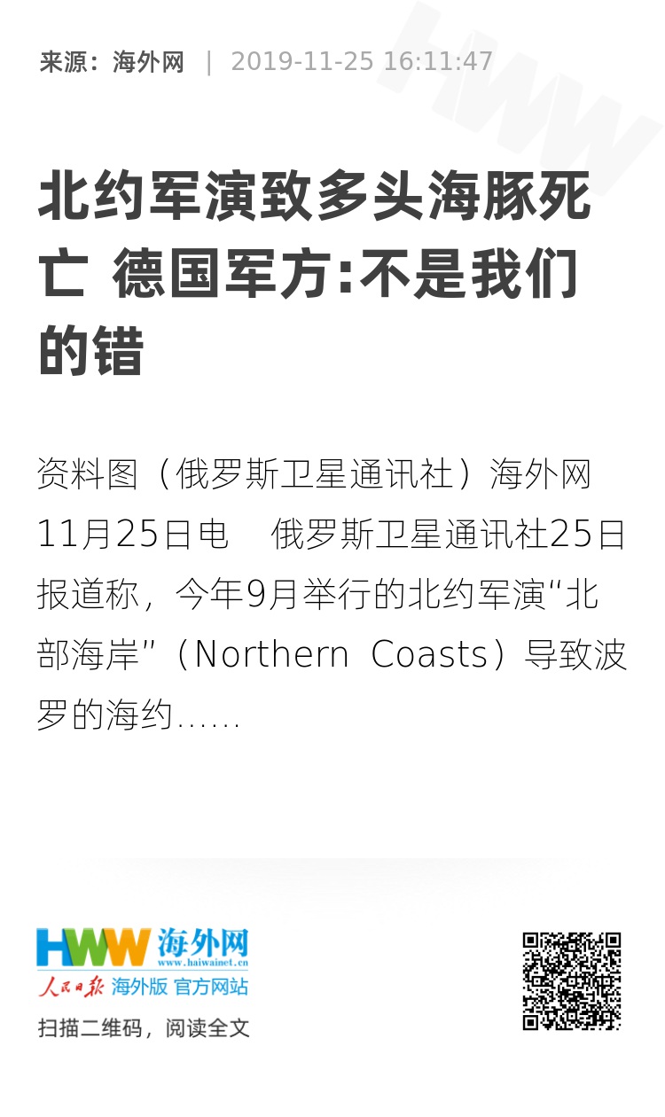 海外网11月25日电 俄罗斯卫星通讯社25日报道称,今年9月举行的北约军演“北部海岸”(Northern Coasts)导致波罗的海约20头海豚死亡。不过,德国军方对此予以否认,称海豚的死因并没有确定,因此不是军方的错。