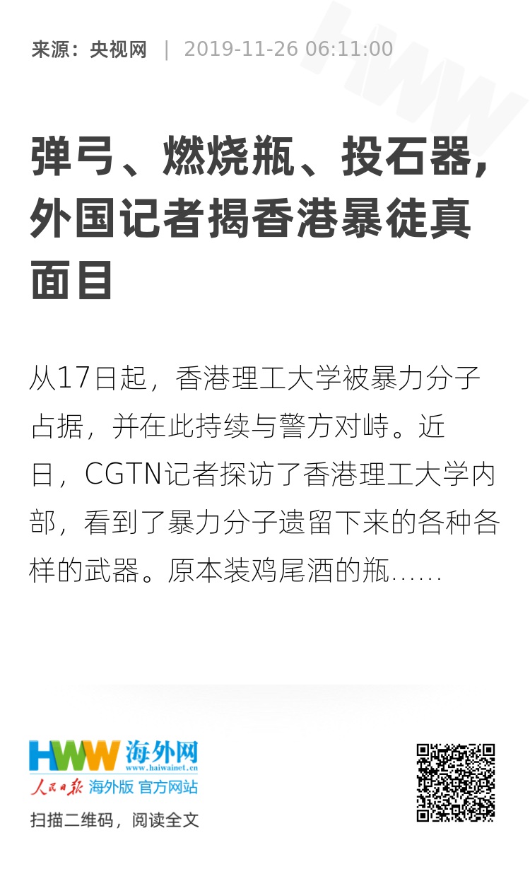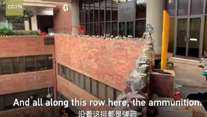 从17日起,香港理工大学被暴力分子占据,并在此持续与警方对峙。近日,CGTN记者探访了香港理工大学内部,看到了暴力分子遗留下来的各种各样的武器。