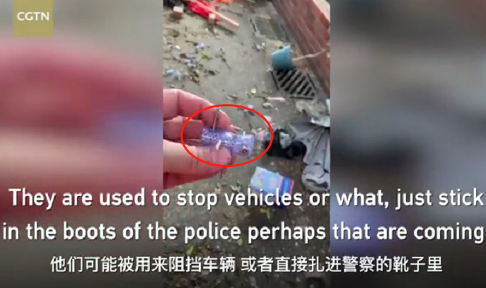 地上还有一些说不出名的玩意,也许可以扎破车轮,甚至扎进警察的靴子↓↓↓