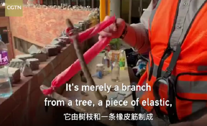 由塑料头盔做成的投石器,穿过橡胶弹力带,被绑在管子、金属棒和横梁上,任何物品都可能成为武器↓↓↓