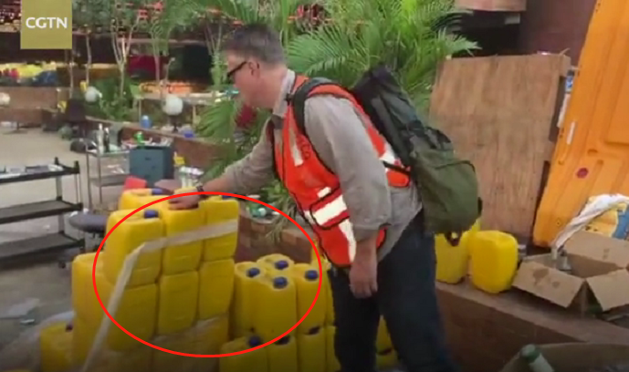 数十个黄色的容器,装满了类似汽油的液体,可以灌装燃烧瓶↓↓↓