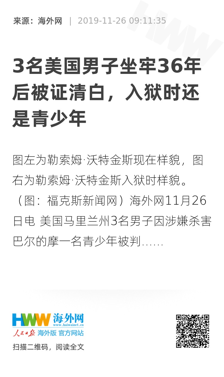 海外网11月26日电 美国马里兰州3名男子因涉嫌杀害巴尔的摩一名青少年被判入狱,坐牢36年后被证实无罪。
