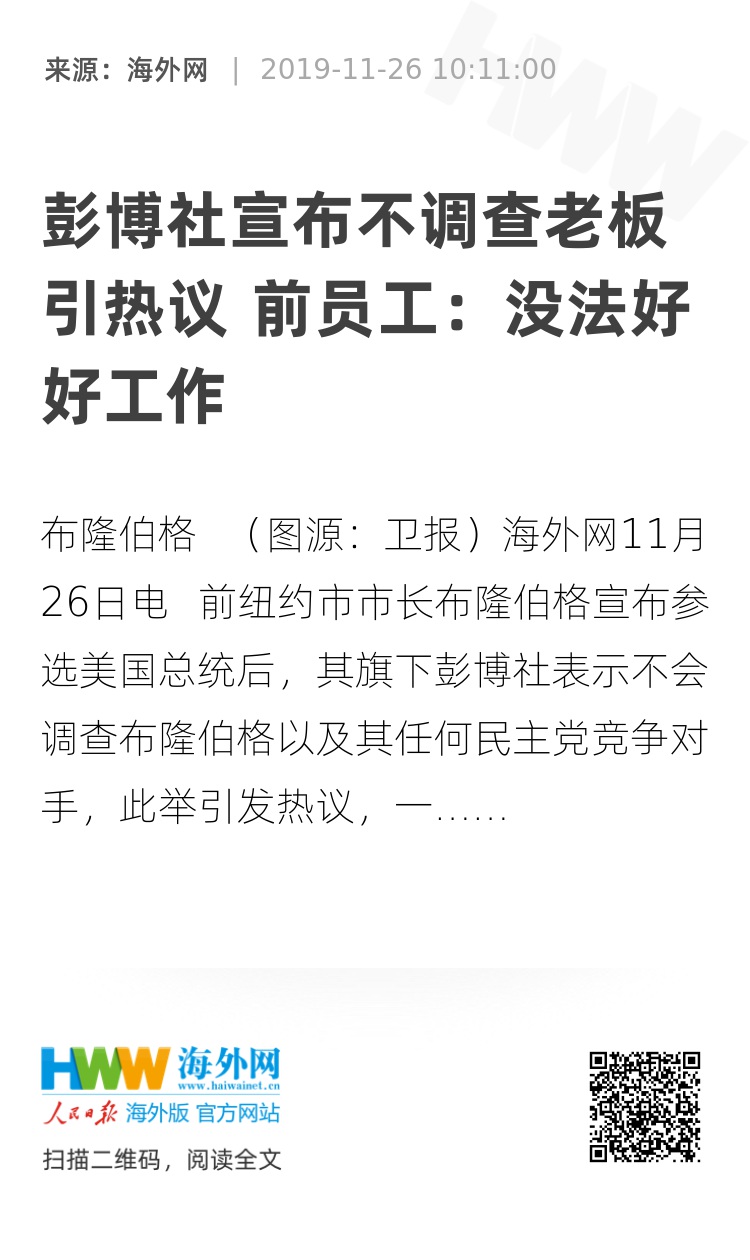 海外网11月26日电 前纽约市市长布隆伯格宣布参选美国总统后,其旗下彭博社表示不会调查布隆伯格以及其任何民主党竞争对手,此举引发热议,一名前员工称,这个决定让人感到震惊。