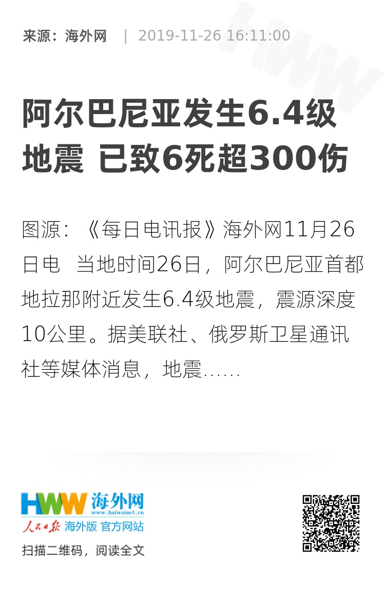 美国地质调查局称,此次地震是阿尔巴尼亚数十年来经历的最强烈地震。(海外网 张霓)
