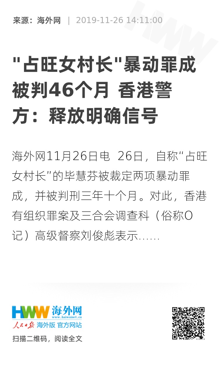 海外网11月26日电 26日,自称“占旺女村长”的毕慧芬被裁定两项暴动罪成,并被判刑三年十个月。对此,香港有组织罪案及三合会调查科(俗称O记)高级督察刘俊彪表示,香港警方对法院的判决表示尊重和欢迎。