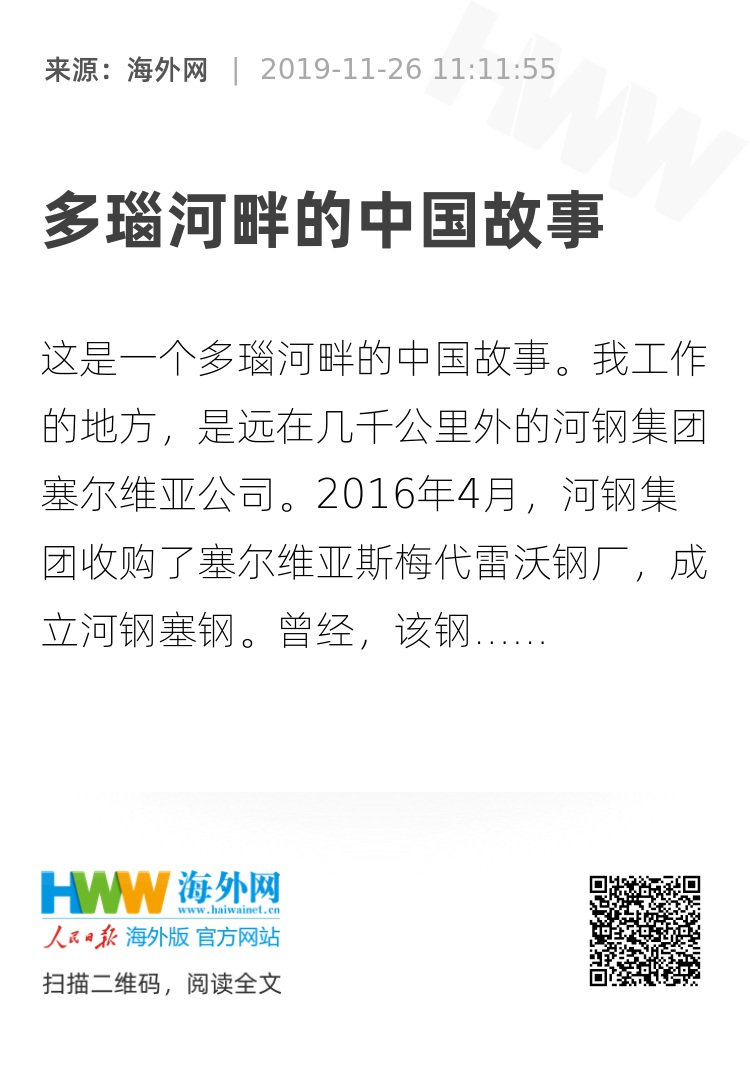 这是一个多瑙河畔的中国故事。我工作的地方,是远在几千公里外的河钢集团塞尔维亚公司。2016年4月,河钢集团收购了塞尔维亚斯梅代雷沃钢厂,成立河钢塞钢。曾经,该钢厂连续7年亏损,5000名职工面临失业。面对负担沉重的百年钢厂,我们利用技术优势迅速恢复产能,利用规模化采购降低成本,利用集团国际化平台使塞钢迅速成为国际化钢铁企业……收购后不到半年,塞钢实现了扭亏为盈,又在2018年成为塞尔维亚第一大出口企业。我们终于把这个厂救活了!