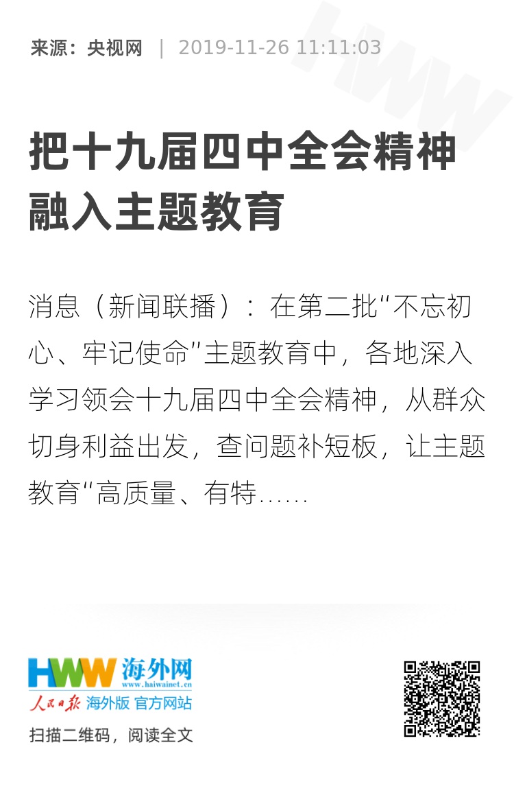 央视网消息(新闻联播):在第二批“不忘初心、牢记使命”主题教育中,各地深入学习领会十九届四中全会精神,从群众切身利益出发,查问题补短板,让主题教育“高质量、有特色、见成效”。