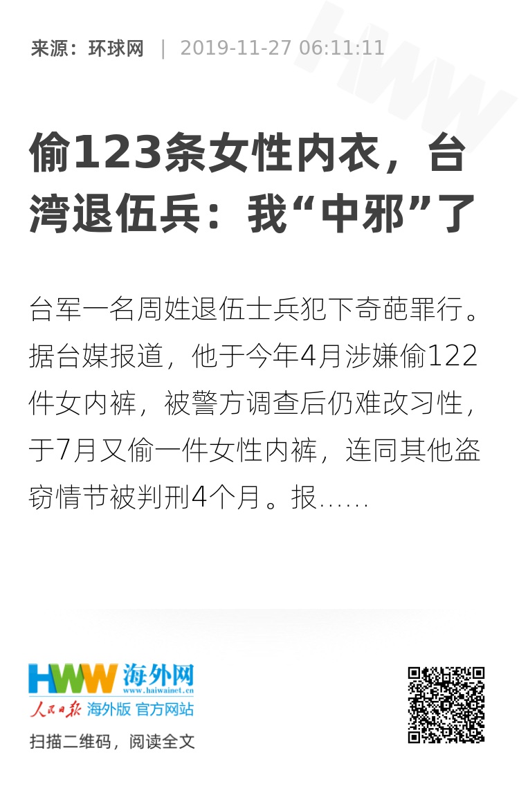 台军一名周姓退伍士兵犯下奇葩罪行。据台媒报道,他于今年4月涉嫌偷122件女内裤,被警方调查后仍难改习性,于7月又偷一件女性内裤,连同其他盗窃情节被判刑4个月。报道称当地邻居都听说过周姓男子,其经常自称退伍之后“中邪”,只有把内裤戴在头上才能睡得着。