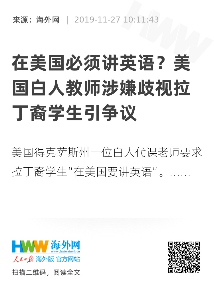 海外网11月27日电 美国得克萨斯州一所高中正在调查该学校一位白人代课老师要求学生“在美国要讲英语”的事件。该事件的视频已经在网络上获得众多关注。