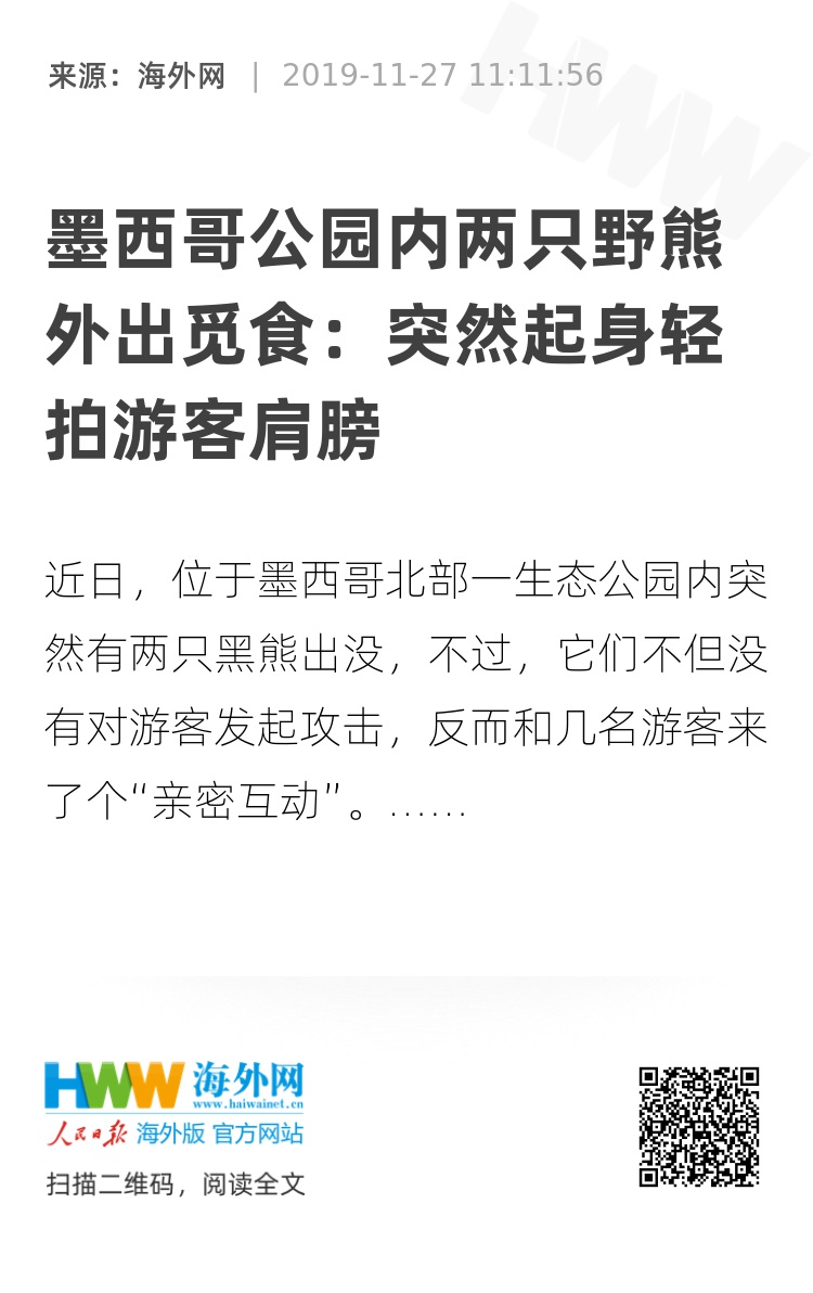 海外网11月27日电 近日,位于墨西哥北部一生态公园内突然有两只黑熊出没,不过,它们不但没有对游客发起攻击,反而和几名游客来了个“亲密互动”。