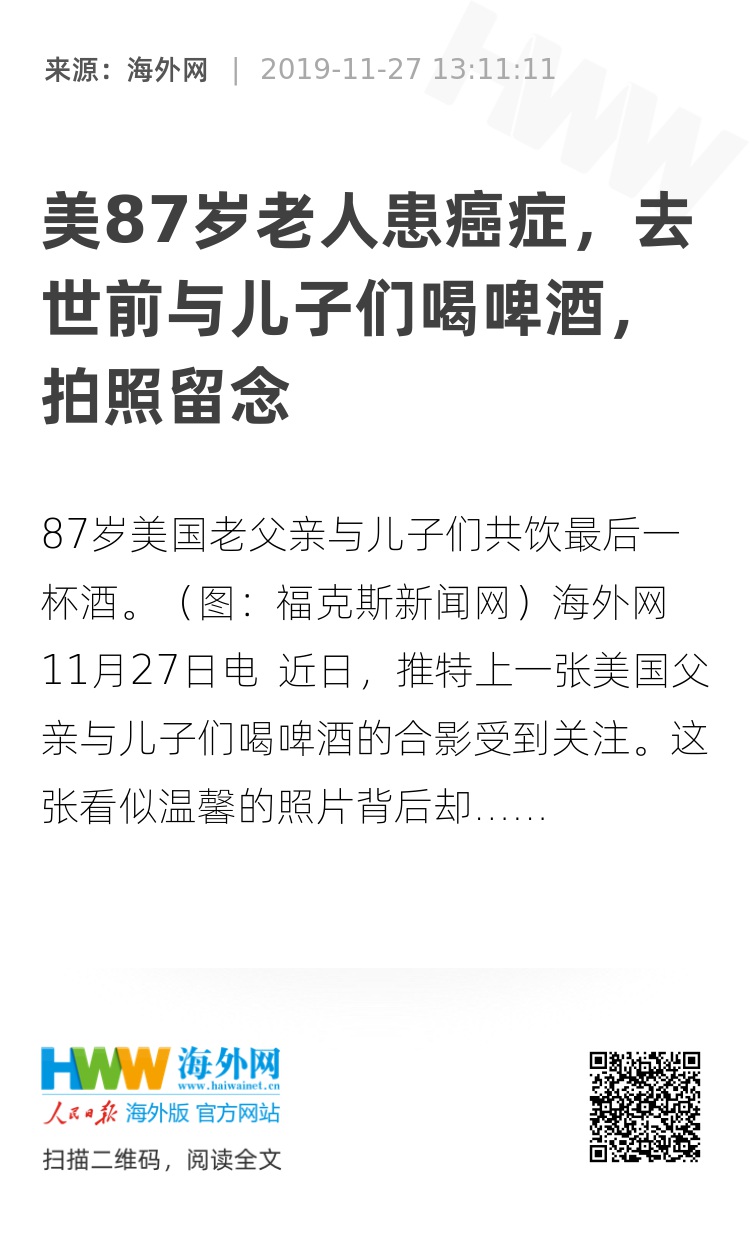斯莫姆透露,祖父患有第四期结肠癌,最后一刻选择和家人一起喝啤酒,“对于祖父来说,那一刻意义重大,你能看出来大家都知道即将会发生什么,但我们都只想享受在一起的最后时光。”(海外网-李萌 实习编译-陈怡帆)