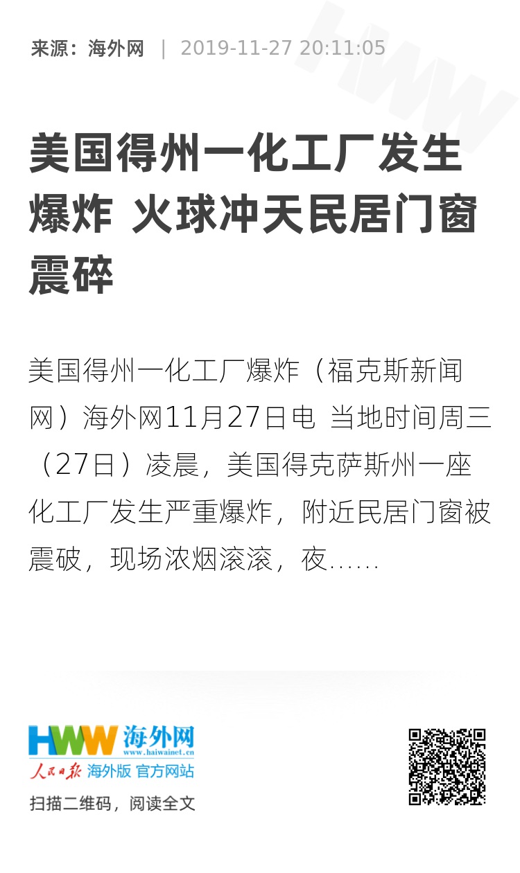 海外网11月27日电 当地时间周三(27日)凌晨,美国得克萨斯州一座化工厂发生严重爆炸,附近民居门窗被震破,现场浓烟滚滚,夜空被冲天火球染成一片橙色。