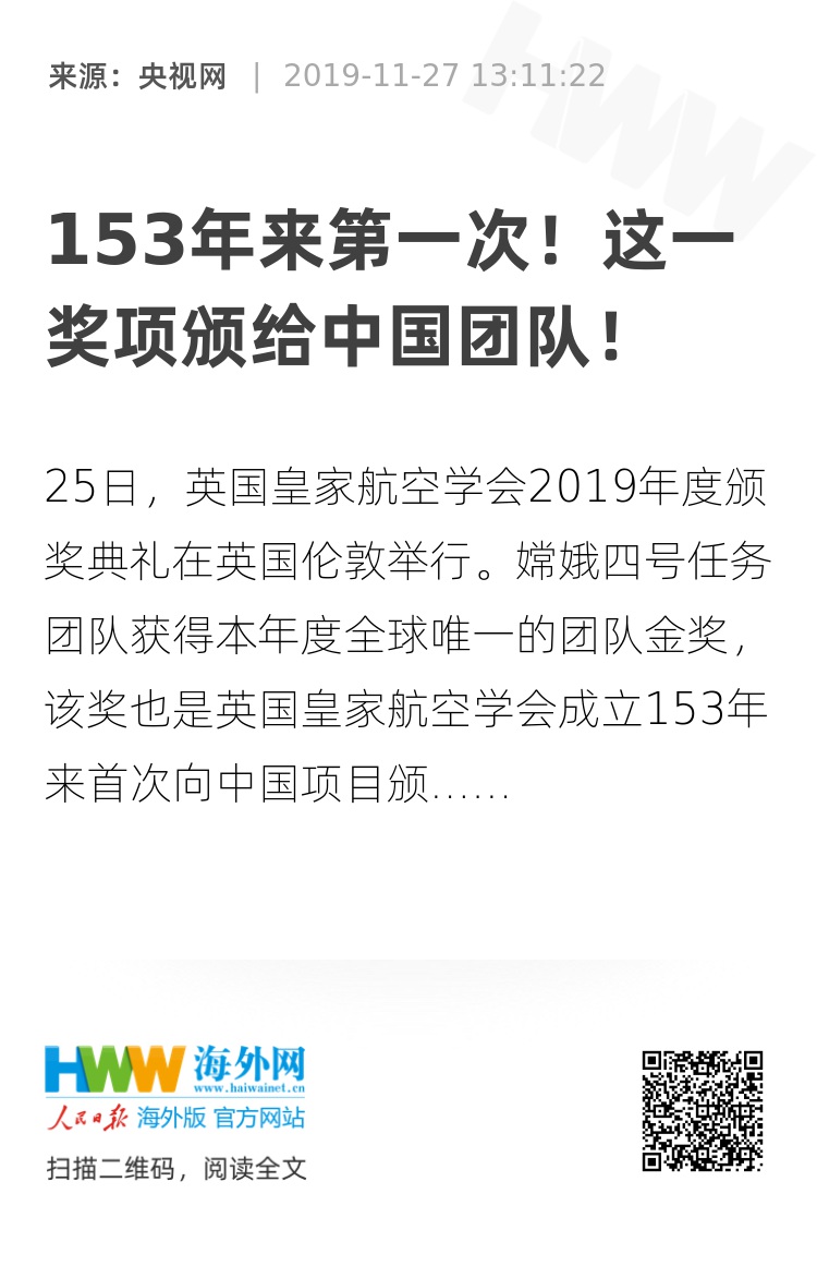 25日,英国皇家航空学会2019年度颁奖典礼在英国伦敦举行。嫦娥四号任务团队获得本年度全球唯一的团队金奖,该奖也是英国皇家航空学会成立153年来首次向中国项目颁发的奖项。