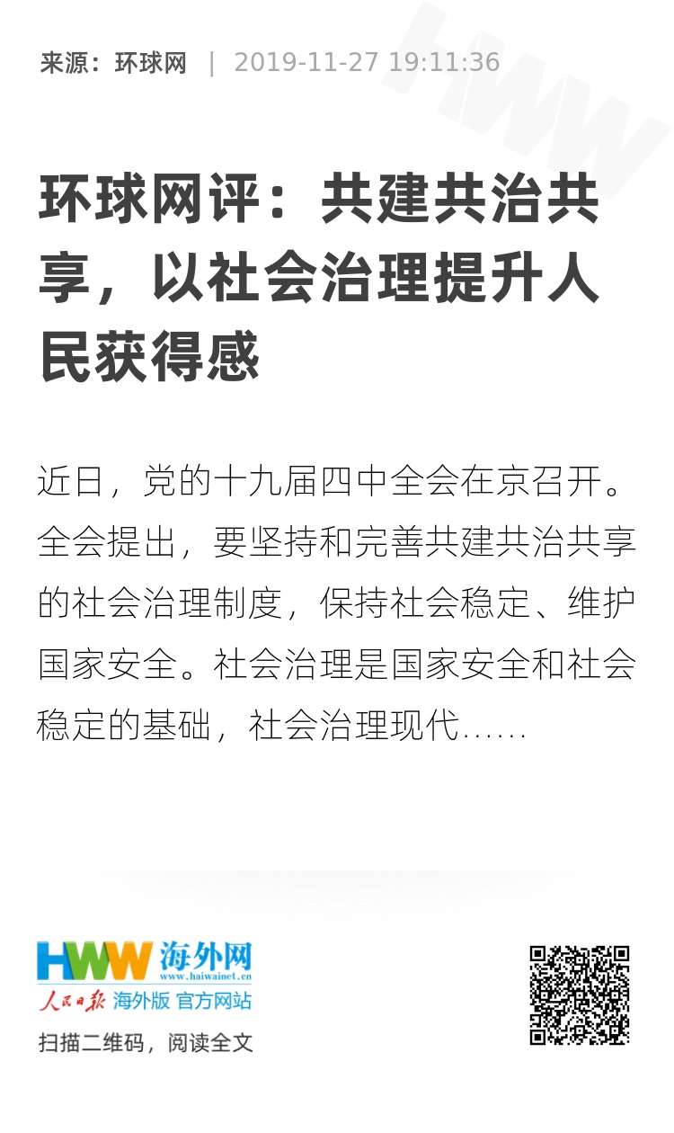 近日,党的十九届四中全会在京召开。全会提出,要坚持和完善共建共治共享的社会治理制度,保持社会稳定、维护国家安全。社会治理是国家安全和社会稳定的基础,社会治理现代化是国家治理体系和治理能力现代化的题中应有之义。