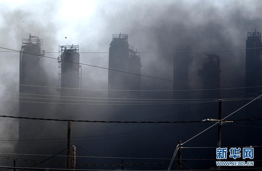 11月27日,在美国得克萨斯州杰斐逊县,发生爆炸的化工厂浓烟滚滚。 美国得克萨斯州杰斐逊县内奇斯港一座化工厂27日凌晨发生爆炸,目前造成3人受伤。 新华社发(宋穹 摄)